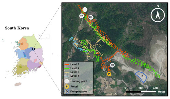 The Yeongcheon underground mine (37°4′14″, 128°18′46″) of Baek Kwang Mineral Products Co., located in Danyang-si, Chungcheongnam-do, South Korea, was selected as the study area (Figure 1). The mine comprises four levels; the average altitude of Levels 1, 2, 3 were 310, 250, and 280 m, respectively, while the lowest for Level 4 was 220 m. The mining method for room and pillar mining produces approximately 120 tons of limestone ore per year. The mine consists of four loading points underground (the IDs of which are 203, 233, 235 and 237) and a dumping area with a crusher on the surface. The ore was transported, using 30 ton dump trucks. The site’s production manager assigns trucks to the loading point daily, accounting for the ore production goals and quality. Next, the truck driver departs to the point to load the ore. The ore is loaded and subsequently moved to the dumping area. The truck driver checks the amount of ore accumulated in the crusher; if the ore quantity does not exceed the crusher capacity, the ore is unloaded into the crusher, and if it exceeds the capacity, the ore is unloaded into the yard. This operation is repeated during the working hours.