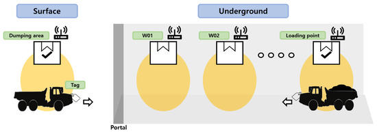 The study area was equipped with a mine safety management system based on ICT. Owing to the installation of a wireless communication network, it was possible to implement a digital environment to track the location of equipment in real time, make voice calls, and monitor the working environment at an underground mine site where communication was not possible. Through the wireless communication network, the location of the production equipment in the mine was received in real time on the dashboard in the office. The data acquired through the safety management system were stored in real time. In this study, the location tracking data of the production equipment were used in the mine safety management system. When the production equipment passes by a wireless access point (AP) installed in the study area, its location is tracked and stored as tag-recognition data. Figure 2 shows the process of a truck being recognized by the wireless APs as it passes by them while transporting ore in an underground mine. The tag recognition packet data, stored as the truck passes, includes information regarding the data category, presence of an emergency, tag recognition sequence, ID of the recognized tag, and distance between the wireless APs and the tag. These data are transmitted once every second, and approximately 200,000 packets are stored in the web server per month; the size of the data packet is 20 bytes each.