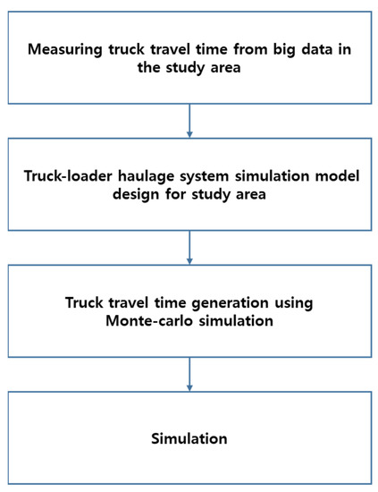 Big data collected for the location tracking of production equipment in the mining safety management systems were analyzed to compare and predict the ore production based on probability density functions. For the simulation, time and simulation parameters were received as input variables, and ore production was obtained as a probability distribution. Through big data analysis, the truck cycle time (TCT), which is the time parameter, was acquired. We designed a stochastic simulation model to fit the truck haulage system of the underground mine selected as the study area. Uniform, triangular, normal, and observed probability distributions were generated by measuring the truck travel time. Travel times and ore production rates were predicted by the Monte Carlo simulation (by applying the probability density functions) and stochastic simulation model, respectively (Figure 3).