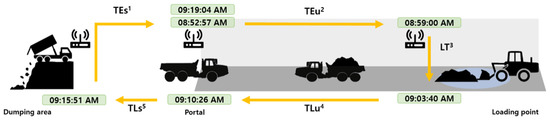 The truck travel time was measured through the following process using big data. In this study, truck tag recognition packet data were extracted from big data for October 2018. The truck tag recognition packet data store approximately 200,000 packets per month. Among the packet data properties, tag recognition time, the IP address of wireless APs, and distance packet information were considered and classified according to the truck workplace. The study area consists of four loading points and four routes were identified. If all the wireless AP recognition data of the identified route do not exist and there are missing data, the data are deleted. By calculating the difference in the recognition time of the wireless APs, we obtained the truck travel time between each wireless AP. If the trucks remained in the recognized range for a considerable amount of time, the distance packet information was used to extract the tag recognition time, which is the minimum distance between the wireless APs and the truck. The difference in tag recognition time of the APs was calculated to measure the truck travel time. The types of truck travel times are as follows: the time lapsed when the truck moves from the portal to the loading point in an empty state (TEu); the time needed to load ore into the truck (LT); the time needed to transport the ore from the loading point to the portal with the ore loaded (TLu); the transport time from the portal to the dumping area and the unloading time in the dumping area (TLs); and the time to return to the portal (TEs) (Figure 4).