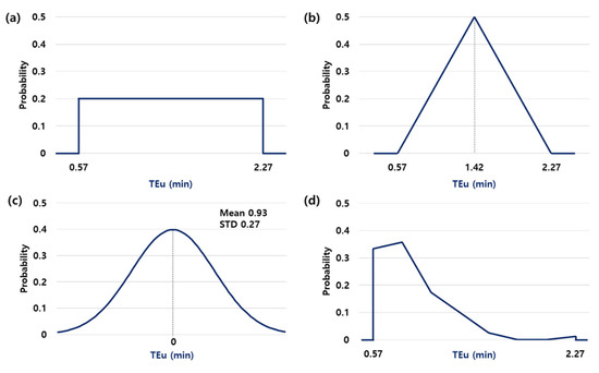 In this study, we compared the simulation results of instances wherein different probability density functions of the measured truck travel time were used as the input variables. The simulation results were compared by creating five temporal elements of the TCT with the Monte Carlo simulation, using the uniform, triangular, normal, and observed probability distributions derived from actual truck travel time data. The uniform, triangular, normal, and observed probability distributions were used in this study because they are widely used as probability density functions and can be defined using the big data of an ICT system. It should be noted that the uniform, triangular and normal distributions are theoretical probability density functions defined mathematically; however, the observed probability distribution is an empirical one. The uniform and triangular distributions were generated by considering the maximum and minimum values. The normal distribution was generated by considering the mean and standard deviation (STD), and the observed probability distribution was obtained using actual accumulated data (Figure 6).