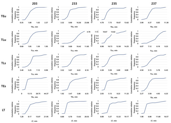 In the study area, the TCT was analyzed using big data recorded in October 2018 (Table 4). Figure 7 shows the cumulative relative distributions of TEu, TEs, TLu, TLs, and LT at each of the four loading points. Loading point 203 required the least time with an average of approximately 22.74 min for a single haulage cycle; loading point 235 required the most time with an average of approximately 34.07 min. Loading point 203 was located closest to the portal, resulting in an average difference of approximately 11.33 min in TCT.