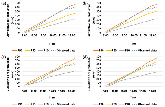 The simulation results indicated the production volumes of P10, P50 and P90. P10 represents the value of the lower 10% ore production, P50 represents a production rate lower than 50%, and P90 represents a simulated rate lower than 90%. If we cross-check the results with the P10 values, we can conclude that the ore production is low, while P50 and P90 are the average and high production volumes, respectively. In all four probability density functions, we confirmed that the actual field data are located within the range of the simulation results. The uniform and the triangular distribution models exhibited similar results for the actual and simulated results of P90. The overall prediction result was lower than that of the actual data. It was determined that the truck cycle time was generated longer than the actual truck cycle time owing to the distribution of the probability density function when the truck cycle time was generated. Conversely, the normal distribution and observed probability distribution models displayed results similar to that of the actual values and P50 as a result of the simulation (Figure 8).