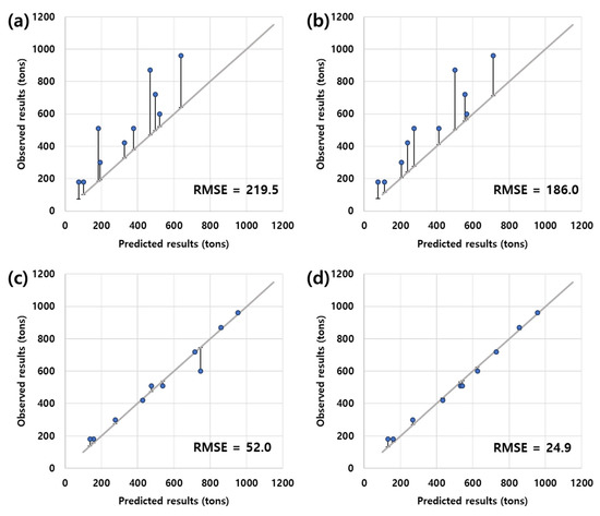 Results of the correlation analysis between the predicted and observed ore productions for ten days in October 2018 for (a) uniform distribution, (b) triangular distribution, (c) normal distribution, and (d) observed probability distribution.