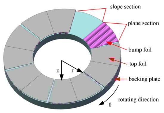The aerodynamic bump foil thrust bearing mainly consists of three parts: the top foil is used to provide lubricating surface; the bump foil plays the role of elastic support; the bearing housing is applied to fix the top foil and the bump foil. The structure of bump foil thrust gas bearing is shown in Figure 1.