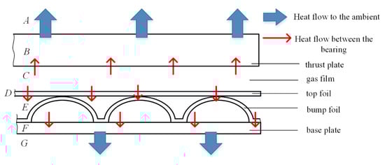 As shown in Figure 2, the entire structural system is divided into six areas along the gas film thickness direction to describe the heat flow. From area A to area G, heat is generated inside the gas film (area C), and one part of the heat is transferred to the ambient or cooling air (area A) through the thrust disc (area B). Another part is transferred to the top foil (area D), and then to the bearing housing (area F) by heat conduction or heat convection (area E) and finally transferred to the open air (area G). When there is cooling air passing through the bump foil channel, only a small part of the heat is transferred to the surrounding air through the bump foil and bearing sleeve.