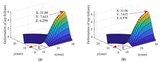 Figure 8 and Figure 9 present the top foil deformations and the dimensionless gas film pressure distributions when the rotor speed is 50 krpm and the initial minimum gas film thickness is 7 μm. Figure 8a,b show the calculation results of the isothermal model and THD model, respectively. It can be seen that the basic variation trends of the top foil deformations calculated by different models are the same, but the top foil deflection calculated by the THD model is larger. This is because the gas film pressure is larger when the temperature effect is considered. The top foil deformation in the inclined section is larger than that of the plane section due to the absence of the corrugated bump foil underneath. The larger foil stiffness in the plane section helps increase the bearing load capacity.