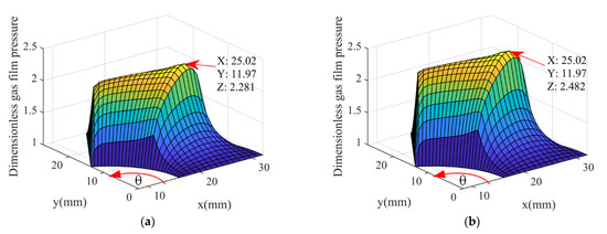 Dimensionless gas film pressure distribution under different thermal model. (a) Isothermal model; (b) THD model.
