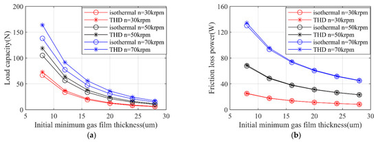 Figure 10 shows the change of bearing load capacity and friction loss power with the initial minimum gas film thickness calculated by the isothermal and THD models. It can be seen from the Figure 10a that bearing load capacity decreases with the increase in the initial minimum gas film thickness. When the initial minimum gas film thickness is increased to 30 μm, the gap between the thrust plate and the top foil is too large. Thus, the lubricating gas film is difficult to form, and the bearing almost has no load capacity. It can be seen from Figure 10b that the frictional loss power decreases as the initial minimum gas film thickness increases, which is because the gas film pressure is very small when the initial minimum gas film thickness is large. However, there is no obvious difference between the values of friction loss power calculated by the isothermal model and the THD model. When the initial minimum gas film thickness is the same, the bearing load capacity and friction loss power both increased when the rotor speed goes up, and the difference between the values of the bearing load capacity calculated by the THD model and the isothermal model increased significantly when the speed reach to higher value. This is due to the rapid rise of the gas film temperature caused by the increased rotational speed, and the gas viscosity increases with the temperature rising up.