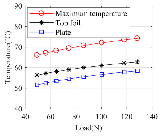 Figure 12 shows the relationship between bearing temperature and the static load at the rotor speed of 50 krpm. The temperatures of top foil and thrust plate are the average values in the simulations. It can be seen from the figure that as the bearing load increases, the gas film temperature increases almost linearly. Additionally, when the bearing load increases, the differences between the maximum air film temperature, the top foil temperature and the thrust plate temperature are almost kept constant. The increase in bearing static load means the gas film is compressed, and the heat generated by the viscous dissipation and the compression in the gas film is larger, resulting in the rise of overall temperature.