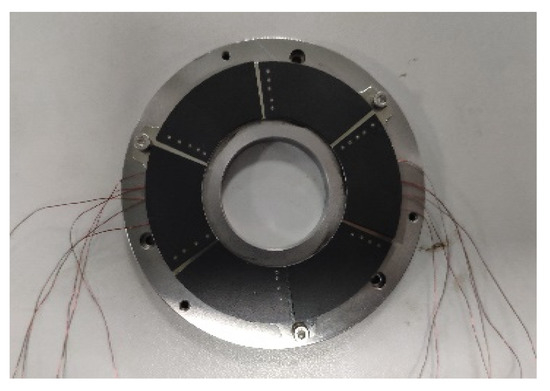 In this paper, the test specimen of the bump foil thrust gas bearing is manufactured and assembled, as shown in Figure 16. The K-type thermocouple is applied to measuring the bearing temperature. A number of thermocouples are stick to the top foil on the back side with copper foil tape. Figure 17 shows the positions of these thermocouples for measuring the local temperature. The thermocouple wire is buried in the bump channel.