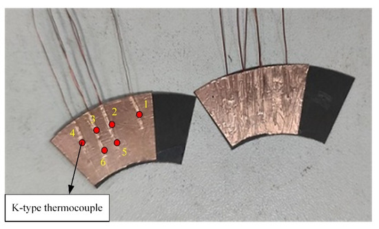 The same number and position of thermocouples are pasted under the two centrosymmetric top foils. The temperature measuring points 1–4 are arranged at the radius of 30 mm, and points 5–6 are arranged at the radius of 25 mm. The temperature measuring point 1 is arranged under the slope section, and the remaining temperature measurement points are in the loading region. The assembly of the bearing is completed by a spot-welding machine.