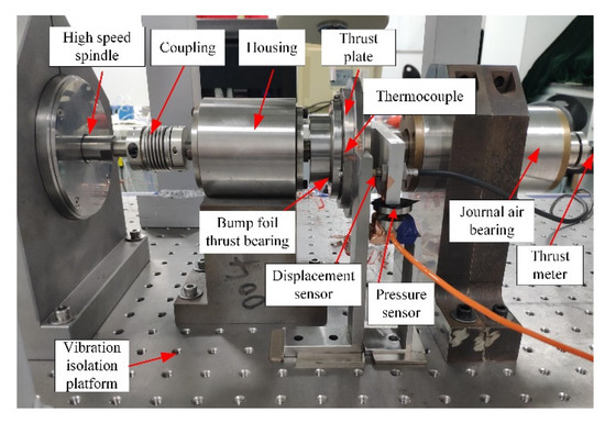 The test bench in this paper is shown in Figure 18. The actual working process of the bearing can be realized by actively controlling the speed of the motorized spindle and by loading the thrustmeter on the other side of the thrust bearing. The displacement between the rotating plate and the bearing is measured by the eddy current displacement sensor.