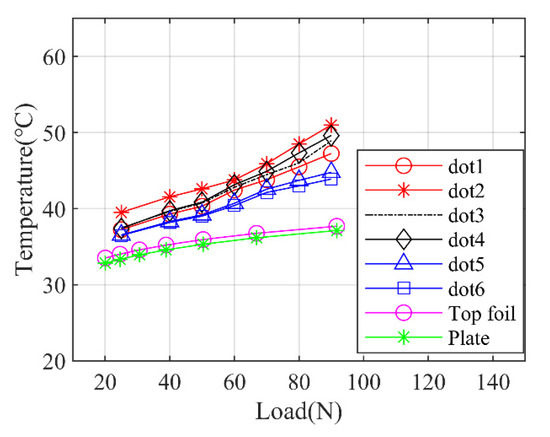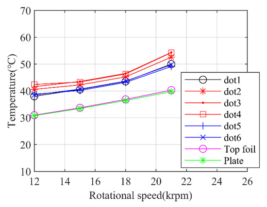 Figure 21 shows the relationship between the measured top foil temperature and rotor speed under the static load of 80 N. It shows that the temperature distribution regularities of the measuring points are similar with the regularities demonstrated in Figure 20, and the overall trend of the measured temperature is the same with the simulation results, which is the temperature will rise up almost linearly with the rotational speed going up. However, the experimental data are relatively higher than the simulation data, which is probably caused by the unclear boundary conditions in the experiments which should be clarified in the simulations or due to the measurement error during the experiment.