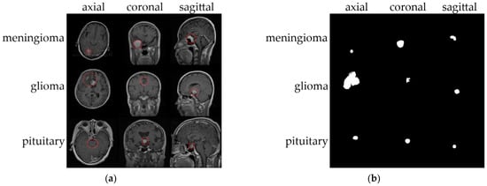 The image database used in this paper consists of 3064 T1-weighted contrast-enhanced MRI images taken at Nanfang and Tianjin General Hospital in China from 2005 to 2010. It was first published on the Internet in 2015, and the last modified version was posted in 2017 []. The database contains images showing three types of tumors: meningioma (708 images), glioma (1426 images), and pituitary tumor (930 images). All images were taken on 233 patients in three planes: sagittal (1025 images), axial (994 images), and coronal (1045 images) planes. Examples of different tumor types and different imaging planes are shown in Figure 1a. Tumors are bordered in red. The number of images per patient varies. In addition to MRI images, the database also contains tumor masks, a binary image where 1 indicates a tumor, and 0 everything else, Figure 1b.