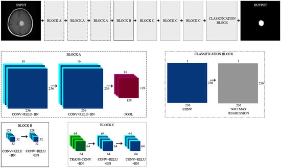 Brain tumor segmentation was performed using a new network architecture with Convolutional layers, developed in Google Colaboratory, with TensorFlow version 2.4.0. and trained on a Graphical Processing Unit (GPU) Tesla P100. The network architecture is modeled based on autoencoders and the U-network [] and consists of an input, three main blocks, a classification block, and an output, Figure 2. The first main block, Block A, represents the encoder part of the network. It consists of two Convolutional layers that keep the same size at the output as the input one. The reduction in Block A is made using a MaxPool layer that halves the input size. The second block, Block B, consists of two Convolutional layers that retain the input size and serve for additional processing of characteristics, as in the U-network. Block C, the third main block representing the decoder part of the network, is similar to Block A, except that instead of the MaxPool layer, it contains a Transposed-Convolutional layer that doubles the size at the input, followed by two Convolutional layers as in Block A. The classification block has a Convolutional layer and a SoftMax layer that gives the probability to classify each pixel of the image.