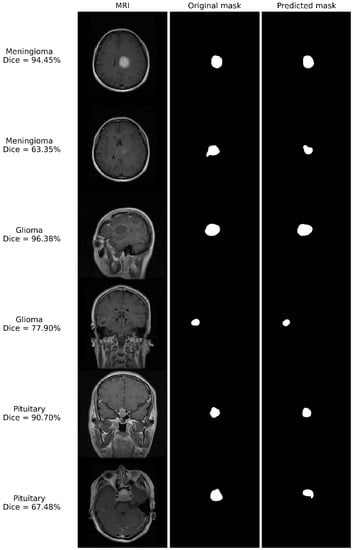 Some of the results of segmentation after training the network on the original data set with record-wise data division are shown in Figure 3. Examples of tumor segmentation with Dice coefficients higher and lower from its median value (83.31%) for each tumor type are presented, along with an MRI image and mask. The segmented images also show the Dice coefficient achieved for that segmentation. Even in the cases where the Dice coefficient is lower, the predicted mask clearly indicates the existence and position of the tumor, which shows the significant diagnostic value of our method.