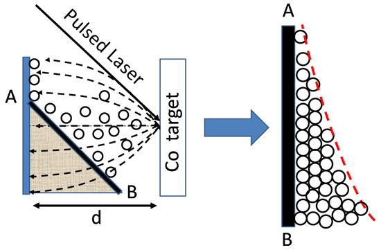 A number of 2D assemblies of Co nanoclusters were grown by pulsed laser ablation (PLA) in high-vacuum environment (base pressure ∼ mbar). The ND:YAG laser operated at 532 nm, with 0.35 J/pulse and a repetition rate of 10 Hz. Its beam was efficiently collimated onto the Co target (99.95% pure) to reach an energy density about 10 J/cm. Grown Co nanoclusters were deposited at room temperature on glass substrates (18 × 18 mm). An XYZ-manipulator allowed us to regulate the relative position of the substrate holder to the ablated Co target. With the above laser parameters, the plume of evaporated Co particles was intercepted by the substrate holder at a z-distance, d∼5 cm, from the Co target, as shown in Figure 1. Prior to deposition, the glass substrate was glued on a 45 wedge and fixed to the holder. Thus, in this off-axis geometry, the substrate was finally orientated at an angle of 45 with respect to the normal of the Co target (z-axis); see Figure 1.