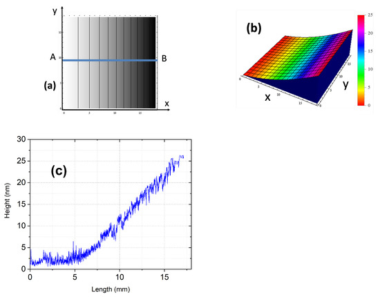 (a) The density plot outlines the expected thickness gradient profile of our sample in off-axis geometry. Blue line AB corresponds to the selected direction for measuring the sample thickness. (b) 3D graph simulates the surface of the Co assembly along AB direction. Color bar scale is in nm. (c) Thickness profile measured along AB direction. Thickness resolution was ≤1 nm with our profilometer (see Supplementary Material for details).