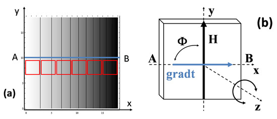 For all the above, a deep insight of the relevant sources in the magnetic anisotropy is crucial to control the processes for magnetization reversal in 2D systems, where MLB is required later. During the last decades, wide research has been driven to the interplay between volume and interface contributions ruling the magnetization anisotropy in epitaxial thin films and multilayers [11,12,13,14]. In the case of ultrathin 2D magnetic systems, a dominant interface contribution can force the magnetization vector to orientate perpendicular to the film plane, overcoming the shape effect. That transition from in-plane to out-of-plane magnetization is controlled by the film thickness, t, and is reported to occur below a threshold value, , when the magnetic anisotropy energy, , is dominated by the interface contribution, [12,15]. The research has been extended to wedged magnetic films [16,17,18,19], where the commented spin–reorientation transition can be easily observed in a thickness range along the film size. For the same purpose, an original approach has been recently proposed in 2D magnetic systems whose magnetic anisotropy energy can be graded along the normal to the substrate plane, e.g., with a graded composition [20,21]. In these last cases, two different magnetization directions could be coexisting in the same physical system, with respective mechanisms for magnetization reversal. That would open a new strategy to design eventually birefringent media from the magnetic point of view.