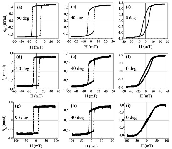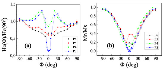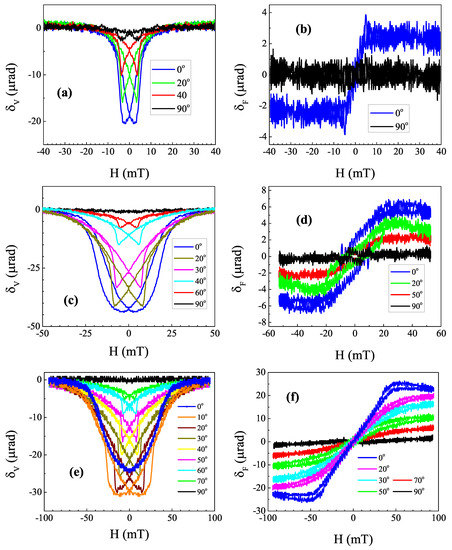 where denotes the loop branch of when H is increasing or decreasing, respectively [28,29]. The resulting and loops for P6, P4, and P3 are shown in respective graphs of Figure 9. Summarized data for P5 and P2 are included in the Supplementary Material. First, the predicted two intensity peaks in MOVE are clearly seen now, their magnitude increasing as both H and TGD tend to be coincident (). That turns that direction into an effective anisotropy axis, where M reversal is conducted perpendicular to the Co nanocluster assembly and completely different to the easy axis () [10,30]. The progressive approach of those peaks indicates an increasing dominance of the coherent rotation to reverse M, as H is parallel to TGD. For P3, they are merged in a single peak at , showing an ideal magnetic linear birefringence [8]. Similar results can also be observed in P2. In these cases, both easy and hard axes are univocally related to respective perpendicular and parallel directions to gradt. Thus, the existence of MLB and UMA in our ultrathin Co nanoclusters assemblies, and its close relation with that thickness gradient, can be definitively settled after measuring and correlating their MOKE and MOVE.