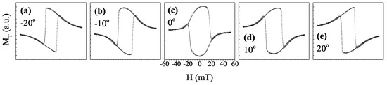 In addition, for P3 piece, M cycles have been measured for H orientation in the angular interval of around that gradient direction. The corresponding results shown in Figure 6 evidence a reversing M under a coherent rotation process, pointing to the thickness gradient as responsible for an eventual out-of-plane magnetization in our samples.