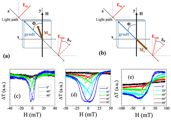 As the transmitted light travels across the sample, its refraction index, n, depends on the relative orientation between its polarization plane and H direction. That yields a rotation angle of the electric field plane, ), as E field is parallel or perpendicular to H [8]. This magnetic linear birefringence arises in magnetic 2D systems showing different mechanisms to reverse their magnetization along easy and hard magnetic axes [8,10]. From the experimental point of view, MOVE appears as intensity changes proportional to T = T− T in the transmitted light. As the sample is driven along its easy axis, T = 0 because M is reversed due to nucleation and growth of domains in the sample plane. On the contrary, as H is applied off the easy axis, a magnetization contribution to M arises in the hard axis, with a different reversal mechanism, i.e., coherent rotation. This would lead us to detect MOVE effect as two symmetric and identical intensity peaks located at ±H values [8,10].