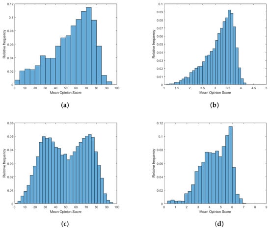 MOS distributions in the applied benchmark IQA databases: (a) CLIVE [50], (b) KonIQ-10k [4], (c) SPAQ [5] and (d) TID2013 [51].