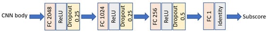 The outputs of the global average pooling layers are connected to six regression heads containing four separately fully connected layers. The inner structure of the regression heads is depicted in Figure 6. Specifically, the first three layers consists of 2048, 1024 and 256 nodes, respectively. To avoid overfitting, these layers possess dropout rates [64] of 0.25, 0.25 and 0.5, respectively. To ensure better gradient propagation, rectified linear units (ReLU) were applied as activation functions in the first three layers [62]. Since the last layer predicts the quality, it contains only one neuron and applies a simple linear activation function. Let denote the training dataset, where is an RGB image of arbitrary size and q is the ground-truth quality score belonging to . Moreover, we denote by the quality score predicted by one regression head. Since image quality prediction is formulated as a regression task here, mean squared error (MSE) loss is applied, which—as the name suggests—takes the mean of squared differences between the ground-truth and predicted values. Formally, this can be written as: .