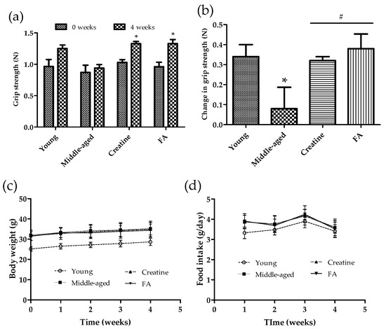 We observed the effect of FA intake on muscle strength in middle-aged mice. After 4 weeks of dietary intake and exercise, grip strength at weeks 0 and 4 were compared. The young mouse group increased muscle strength by about 0.34 N for 4 weeks, whereas the middle-aged mouse group showed little increase. However, the middle-aged mouse group fed a diet containing creatine or FA increased muscle strength significantly (Figure 1a,b). Changes in dietary intake and body weight were almost similar for each experimental group (Figure 1c,d).