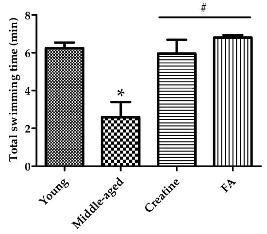 The intake of FA also showed an effect in the forced swimming test (Figure 2). The younger group of mice continued swimming for 6.24 min, while the group of middle-aged mice only lasted about 2.58 min. Groups of middle-aged mice fed a diet containing creatine or FA revealed significant differences by continuing to swim for 5.97 and 6.81 min, respectively.