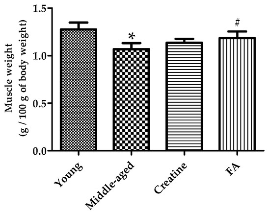 Relative weight of muscle (gastrocnemius + soleus) to body weight. Data are expressed as the mean ± SD (n = 5 mice per group), and p-values < 0.05 (*) as compared with the young control or p-values < 0.05 (#) as compared with the middle-aged control mice.