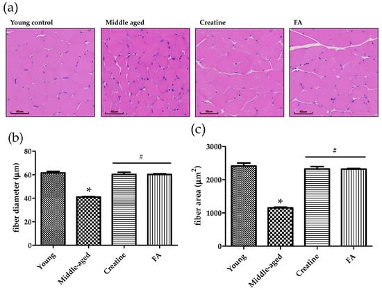 Skeletal muscle fiber stained-images, diameter and area. (a) Representative gastrocnemius muscle histological images, (b) quantification of skeletal muscle fiber diameter, (c) and fiber area. Data are expressed as the mean ± SD (n = 3 mice per group), and p-values < 0.05 (*) as compared with the young control or p-values < 0.05 (#) as compared with the middle-aged control mice.