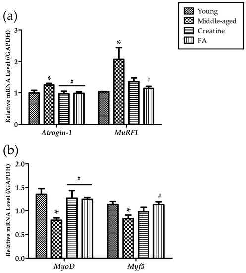 In soleus muscle tissue, the expression of genes related to muscle protein degradation (Atrogin-1 and MuRF1) and muscle synthesis (MyoD and Myf5) were examined. Atrogin-1 was significantly increased in the middle-aged mouse control group compared to young mice, and the creatine intake group and FA intake group were significantly decreased compared to the middle-aged mice. This trend was even greater in MuRF1, which increased twice in the middle-aged mouse experimental group compared to the young mouse, and the FA intake group significantly decreased to a level of 55% compared to the middle-aged mouse (Figure 5a). On the other hand, the expression of MyoD and Myf5 related to muscle synthesis by ingestion of FA showed a tendency to decrease significantly in middle-aged mice compared to young mice, and it was confirmed that FA significantly improved both factors (Figure 5b).