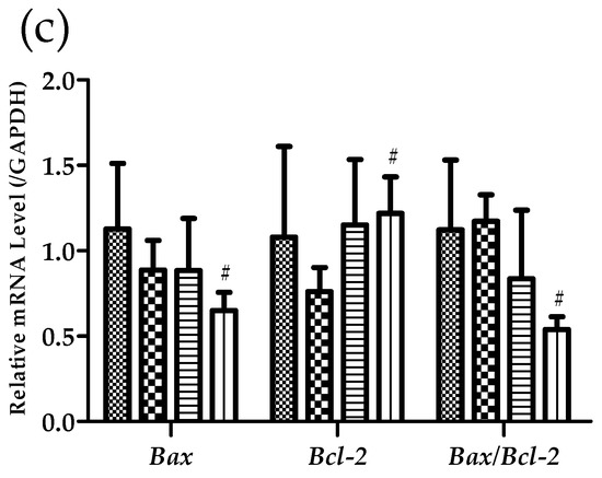 In addition, changes in the expression of Bax (BCL2 associated X, apoptosis regulator) and Bcl-2 (B-cell lymphoma 2) genes related to muscle cell apoptosis were also correlated with the improvement of muscle mass and strength. Bax, together with Bak (Bcl-2 antagonist/killer 1), is a kind of nuclear-encoded protein present in higher eukaryotes and can induce apoptotic cell death by penetrating the outer membrane of mitochondria [36]. In addition, Bcl-2 family proteins are involved in apoptosis, and although the specific mechanism is controversial, in some cases, they exhibit pro-survival activity and prevent apoptosis [37]. There is a report that the expression of Bax protein decreases and Bcl-2 level increases through exercise, which can alleviate the Bax/Bcl-2 ratio that increases with age in the aging heart and consequent apoptosis [38]. Our experimental results could be inferred that the decrease in Bax expression and the increase in Bcl-2 expression through exercise in middle-aged mice were further increased through FA intake.