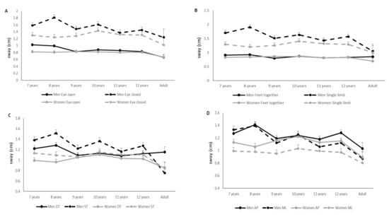 29. Nolan, L.; Grigorenko, A.; Thorstensson, A. Balance control: Sex and age differences in 9-to 16-year-olds. Dev. Med. Child Neurol. 2005, 47, 449–454. [Google Scholar] [CrossRef]