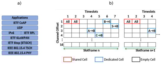 (a) 6TiSCH Protocol Stack (b) Time Slotted Channel Hopping Slotframe.