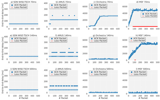 Increasing the sending period to 140 ms results in the graphs Figure 4e,f, which shows that for the centralised schedulers there is no variation and the 50 ms for SDN WISE-TSCH and the 50 ms to 120 ms for AMUS are still maintained. In Figure 4g for Orchestra, a more stable behaviour is observed because there are fewer packets in queue, as seen in Figure 4h, where a clear improvement in packet loss and end-to-end delay is observed, since a higher available bandwidth allows unicast cells with the other nodes to be negotiated with the other nodes.