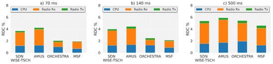 The energy consumption in TSCH is mainly due to radio use and can be estimated as the fraction of time that each node remains in the transmit and receive states. Therefore, the use of different scheduling processes causes a large variation in power consumption over the same scenario. In Figure 5a the different schedulers are observed with a packet period of 70 ms. MSF has the lowest consumption, which is due to the use of a shared slot and the dynamic allocation of the dedicated slots. Orchestra has a slightly higher consumption with a higher use of the radio in transmission due to the fact that in addition to the shared slot, it has a dedicated transmission slot in each node. For SDN WISE-TSCH and AMUS, the same amount of transmit and receive states are used. The difference in consumption is due to the amount of control traffic sent by each. SDN WISE-TSCH uses a proprietary protocol to exchange messages with the controller with less impact on bandwidth. AMUS uses the RPL protocol in addition to the communication with the PCE.