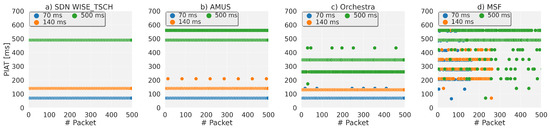 The transmissions of each flow are performed independently, from the source at node 9, to the sink at node 1, for the four types of schedulers. In Figure 4a–d, a packet is sent every 70 ms. The centralised schedulers, such as SDN WISE-TSCH and AMUS, achieve the lowest delay, 50 ms for SDN WISE-TSCH and for AMUS a variation between 50 ms and 120 ms. The AMUS changes are due to the control traffic that accumulates in the same queue as the data flow, and in this case the queue is never more than 2 packets. However, with Orchestra there is an average delay of 2300 ms, due to the fact, that by default, Orchestra only allocates one unicast transmission slot in each slotframe. Therefore, this sending period (70 ms) is the maximum that Orchestra can have with a slotframe length of 7 timeslots. Because it must also send RPL control packets, there is an accumulation of packets in the queues, which is observed as a progressive rise from the 100th packet. In this case the queues reach a size of up to 40 packets, which causes an increase in the end-to-end delays. The most critical case is that of the MSF, which has the same drawback as Orchestra: 1 transmission slot per slotframe. In addition, at the beginning of transmissions, a timeslot shared with other nodes is used, which causes collisions. As retransmissions are enabled, the number of packets in queue grows faster than in Orchestra, as colliding packets accumulate, resulting in long delays and a large number of (network) losses.