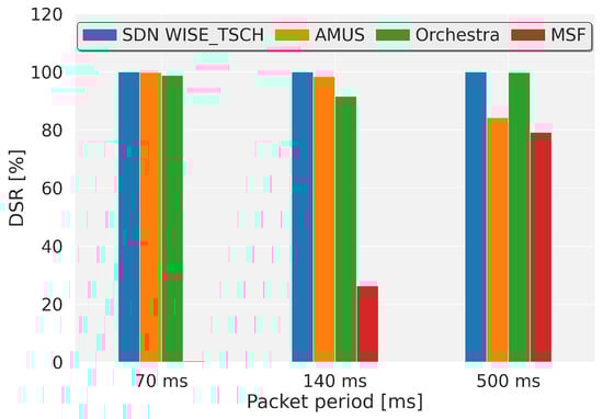 The DSR makes it possible to cumulatively observe the total number of packets that are received in a time less than or equal to the packet period. A high DSR value entails a constant and predictable flow between the source and the destination, which leads to greater determinism. In Figure 7, SDN WISE-TSCH achieves a deadline satisfaction rate of 100% in all cases due to the fact that in this scheduler the flows are differentiated and the TSCH scheduling adapted to be below the deadline. AMUS achieves 98%, 90% and 84% due to the lack of synchronisation between generation and scheduling, which can cause the transmission to be delayed with the next slotframe. When this happens the control packets can be sent by the cells assigned to the data traffic. Orchestra maintains a high DSR in all cases 95%, 90% and 95% but like AMUS, it is affected by control traffic that it cannot differentiate. However, for high packet generation periods it is not affected because the bandwidth does not depend on the scheduled traffic, it depends on the slotframe length. Therefore, in this case Orchestra has a larger amount of bandwidth available. MSF reaches 79% under favourable conditions, when network congestion is low.