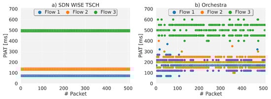 The results for the packet inter-arrival time are shown in Figure 8, with a packet period of 70 ms for flow 1, 140 ms for flow 2 and 500 ms for flow 3. The nodes transmitting these flows are 8, 9 and 10, as shown in Figure 8. Figure 8a shows how SDN WISE-TSCH performs a clear differentiation of the packets, guaranteeing regular arrival for each data flow, obtaining a DSR of 100% for both flows. in contrast with Orchestra (b) where the flows have variations that exceed the packet period. The DSR values obtained are 17%, 41% and 58%, this performance is clearly lower than that shown in Figure 6, because the network has a higher saturation and the available bandwidth is the same in both cases.