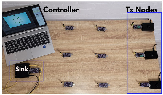 Most of the papers that evaluate scheduling algorithms only work in simulation environments and experimental evaluations are limited. In this work, in order to verify the results obtained in the simulation, the topology of Figure 3 was set up in a real environment, using 10 OpenMote B nodes with the Contiki-NG operating System. In order to obtain a multi-hop network in a reduced space, the transmission power of the nodes was set to −15 dBm, while the other parameters are the same as those used in the simulation. To capture the packets and obtain the throughput statistics, transmitting nodes 8, 9 and 10 and the destination in the Sink are connected to a Raspberry Pi. The result is the topology shown in Figure 9.