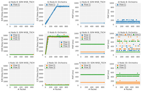 In contrast, Orchestra Figure 10f presents delays for all flows of up to 4000 ms and a high number of losses. This is due to the congestion of the queues, where Orchestra cannot configure enough bandwidth for the flows generated by the node. Because of this, the PIAT is stable in SDN WISE-TSCH Figure 10g, where it stays close to the packet generation period, while in Orchestra this lack of bandwidth is reflected with a high dispersion Figure 10h. Node 10, has the flows with the lowest bandwidth requirement, so the end-to-end delay for the two protocols in Figure 10i and Figure 10j, is very similar, with small exceptions that are due to the RPL traffic that is sent by the unicast queues. In this case the PIAT is also seen to be more bounded Figure 10k and Figure 10l, so the performance at this node is very similar for the two case studies.