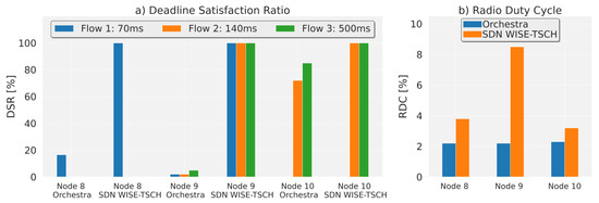 The low delays obtained by SDN WISE-TSCH and the constant PIAT values demonstrate the determinism of this proposal. This can be seen in Figure 11a, where in all nodes the deadline can be guaranteed for each flow with a rate of 100% in contrast to Orchestra which needs low saturation conditions, as was the case in node 10, to be at 85%. For node 9, which generates the most traffic, Orchestra cannot guarantee the deadlines, obtaining only 2% in the best case. Finally, for node 8, Orchestra obtains only 17%.