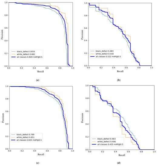 Table 3 shows the mAP obtained through the PR curve for the training and test datasets of the preprocessed, typical preprocessed and raw image learning models in Figure 16. The mAP of the training data was 84.9% for the preprocessed image learning model, 82.0% for the typical preprocessed image learning model, and 78.0% for the raw image learning model. The mAP of the test data was 51.2%, 43.5% and 40.8%, respectively.