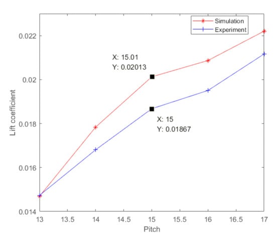 Five groups of data are selected for comparative verification. The lift values obtained by simulation are shown in Table 2. The values are compared with the experimental results through the form of the lift coefficient, as shown in Figure 3.