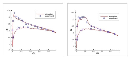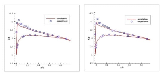 From the above figures, the overall trend of the pressure coefficient calculated by the simulation is consistent with the experimental results at different Mach numbers; the data are almost consistent but errors exist at the leading edge of the airfoil, which ranges from 15% to 20%. When the Mach number reaches a certain value, the position of the maximum pressure coefficient of the airfoil will move backward from the leading edge of the airfoil.