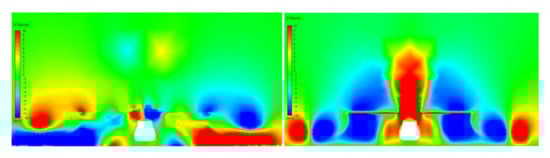The size of sand particles will affect the force of dust in the flow field, and then affect the movement and distribution of dust. Considering that there are various particles of different sizes in the actual sand-dust environment, this paper compares the dust particle radius of 10 um and 50 um, and the results are shown in Figure 17, Figure 18 and Figure 19.
