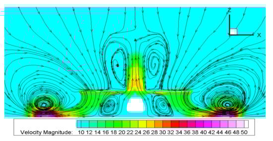When the height is h/R = 0.52, the rotor ground effect flow field is calculated by using the sliding grid method. The time step size is the time required for each degree of blade rotation. The velocity and streamline distribution are shown in Figure 6 and Figure 7. The x direction is the in-coming flow direction, and the z direction is the direction perpendicular to the ground.